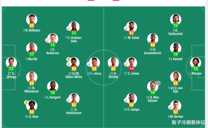 诺丁汉森林杆位:27-奥尔特加、5-穆里略、31-米伦科维奇、34-埃纳、3-内科·威廉姆斯、6-桑加雷、8-埃利奥特·安德森(75’20-卢卡)、21-哈钦森(61’29-巴卡瓦)、10-吉布斯·怀特、7-奥多伊(61’14-恩多耶)、19-伊戈尔·热苏斯(75’16-多明戈斯)。